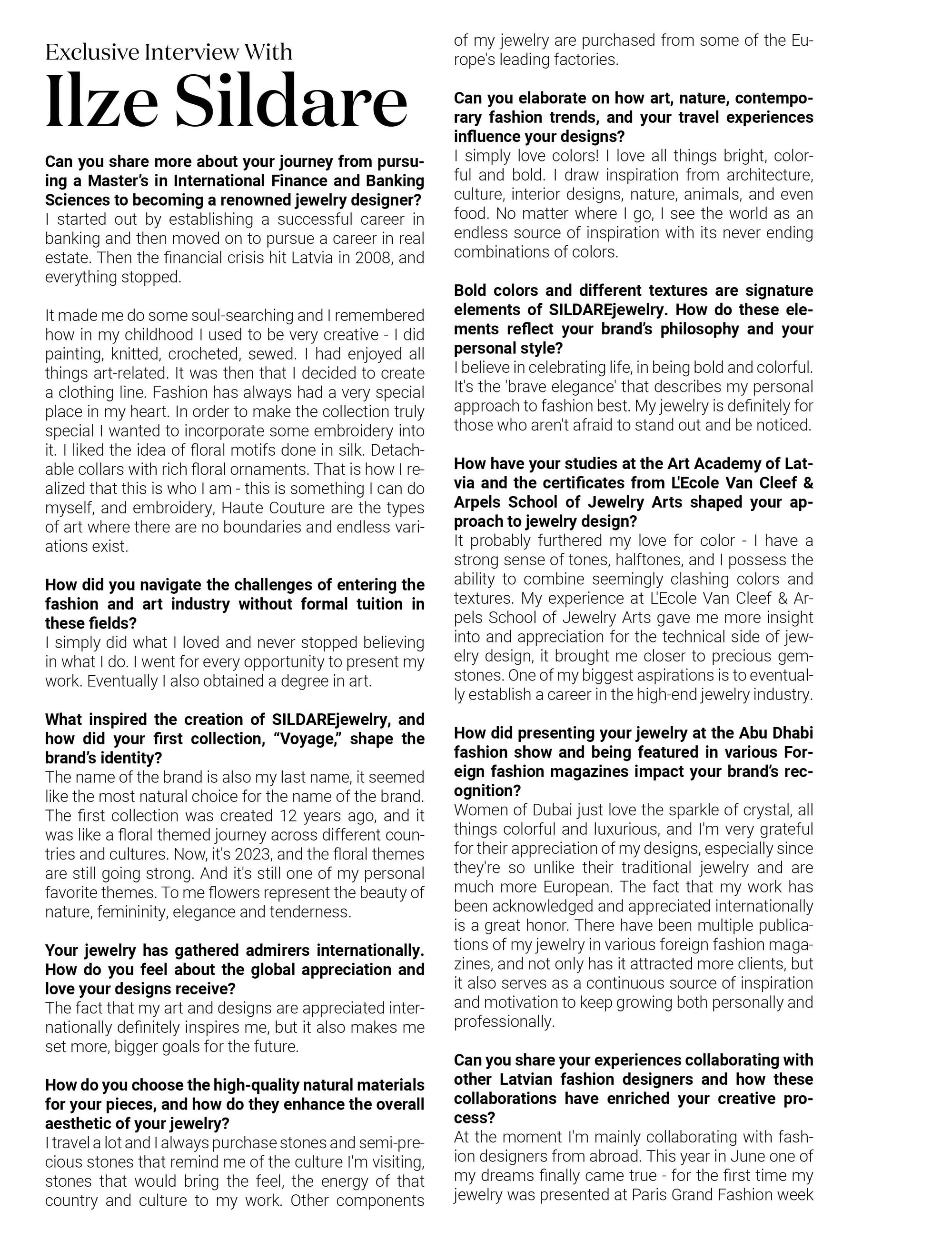Featured in over 110 international and Latvian publications, including the French fashion journal MALVIE and New York’s ARTEGO Magazine